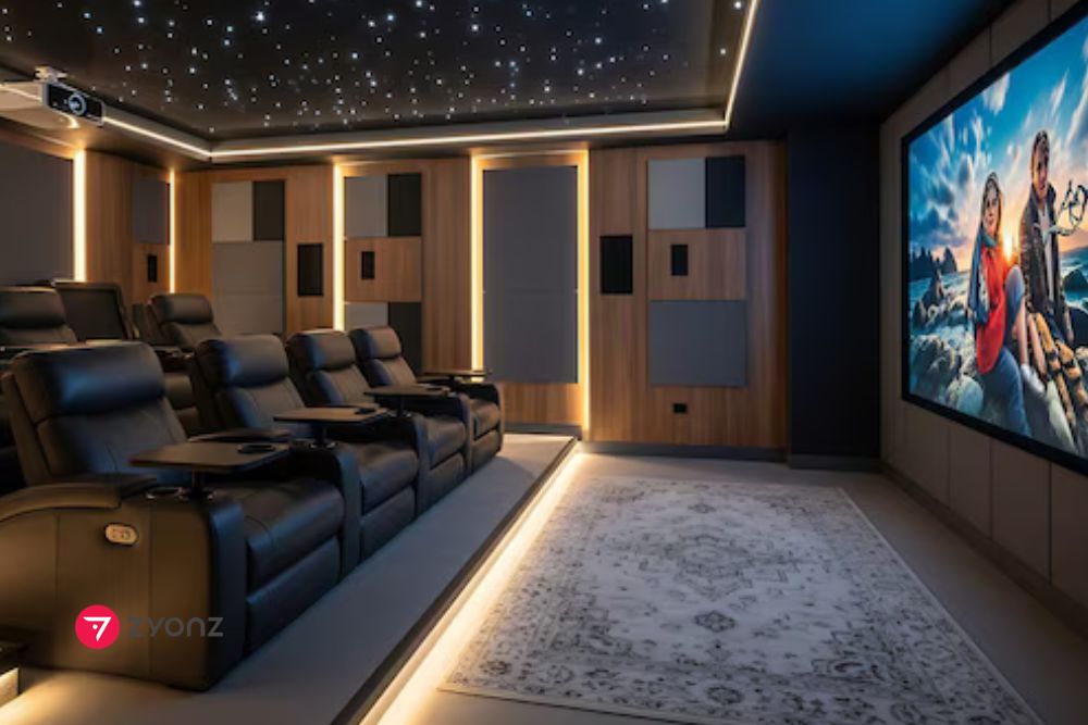 Zyonz Technologies specializes in designing and delivering premium home cinema interiors that combine aesthetics, acoustics, and smart automation. From customized wall treatments and ceiling designs to intelligent lighting and seamless audio-visual integration, each cinema space is tailored to enhance immersion and comfort. With expertise in modern automation and entertainment solutions, Zyonz, smart home automation company transforms ordinary rooms into sophisticated home cinema environments that reflect both technical excellence and refined interior design.